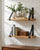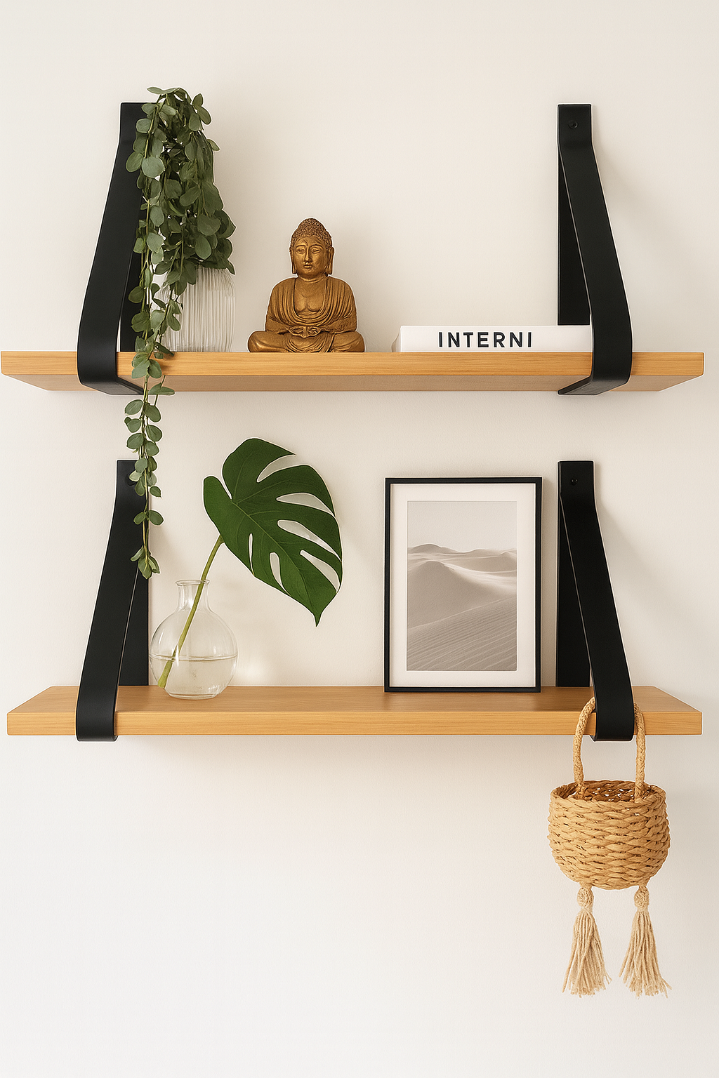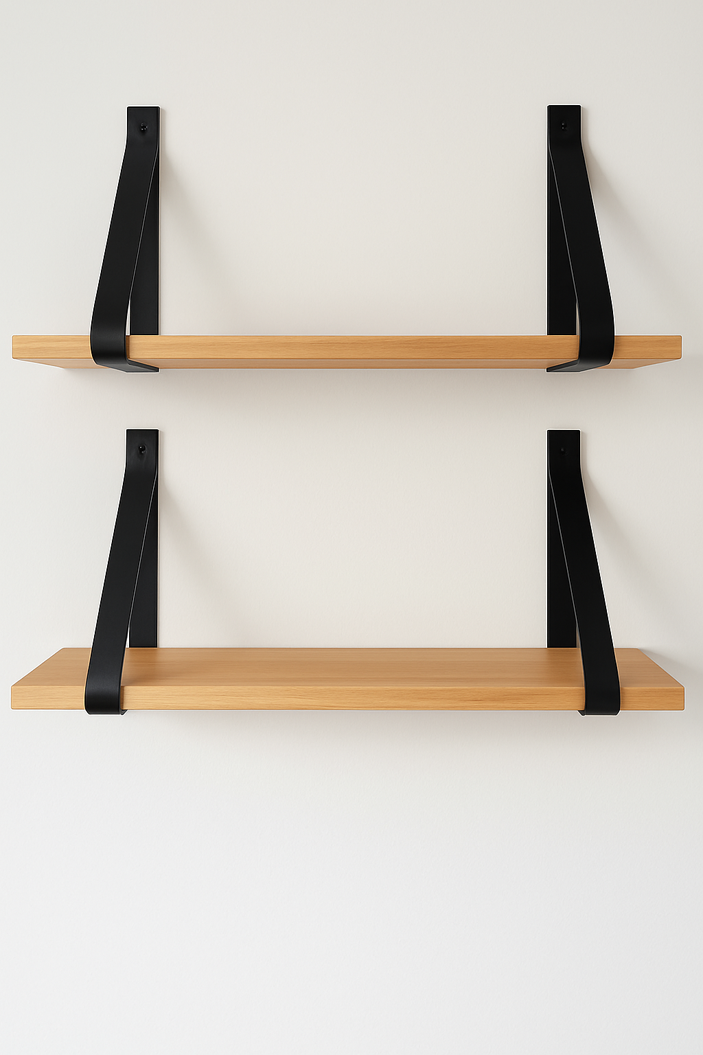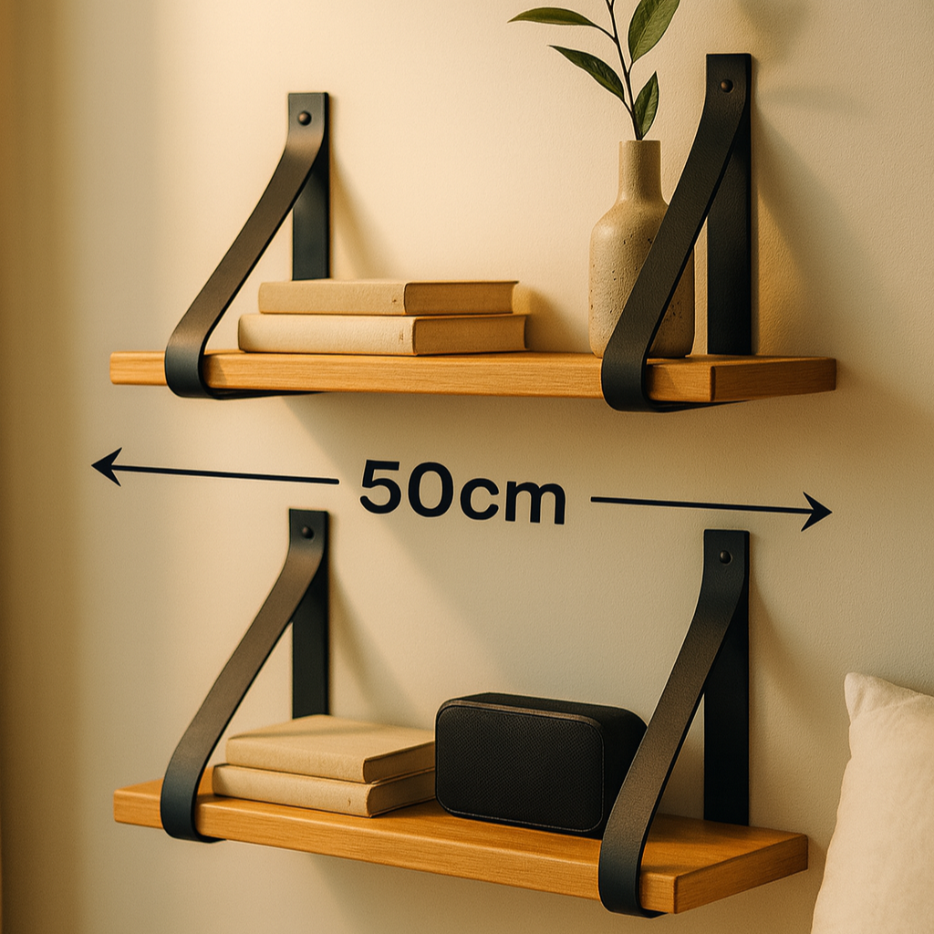 Incluye 2 repisas de madera con acabado natural, cada una equipada con base y soportes de cuero que garantizan una instalación sencilla y una mayor estabilidad.